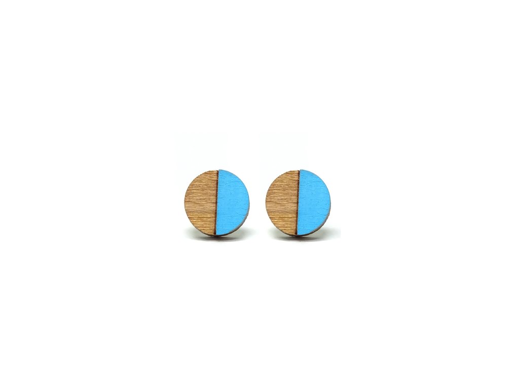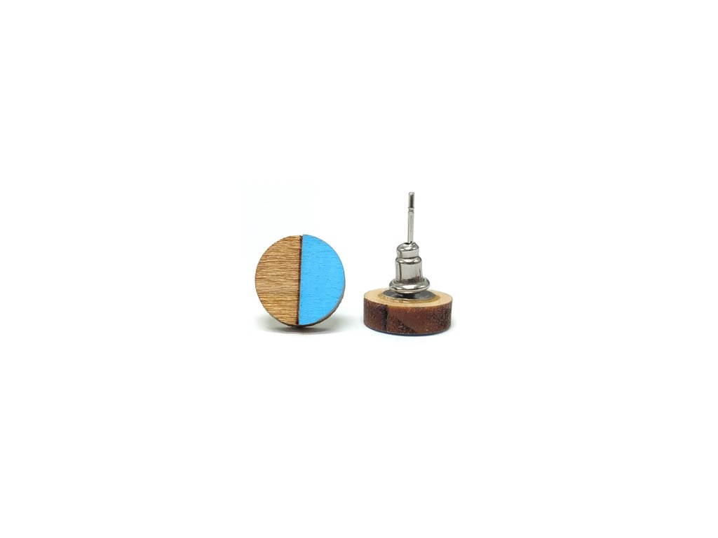 Dřevěné kulaté náušnice z přírodního dřeva s modře barvenou polovinou. Lehký, originální doplněk ruční výroby. Ručně vyráběné s láskou v Jablonci nad Nisou, s důrazem na kvalitu a jedinečný design.