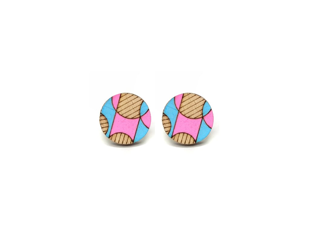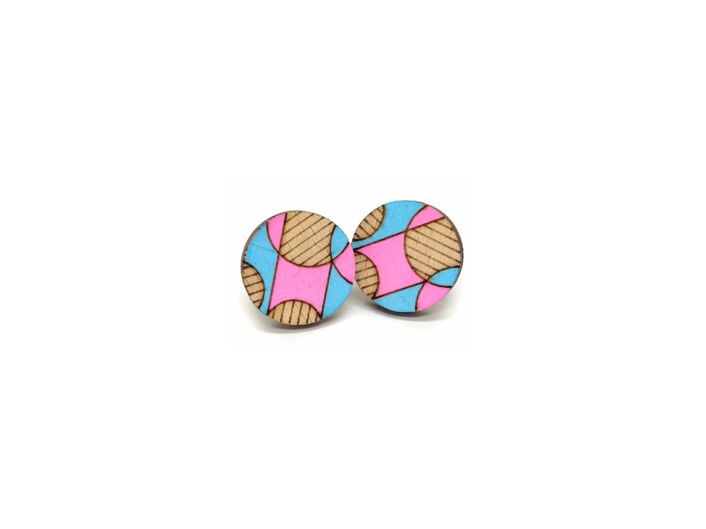 Dřevěné náušnice kruhy růžovo modré jsou částečně upraveny akrylovou barvou.