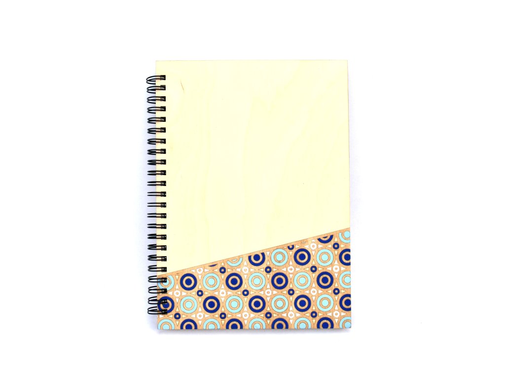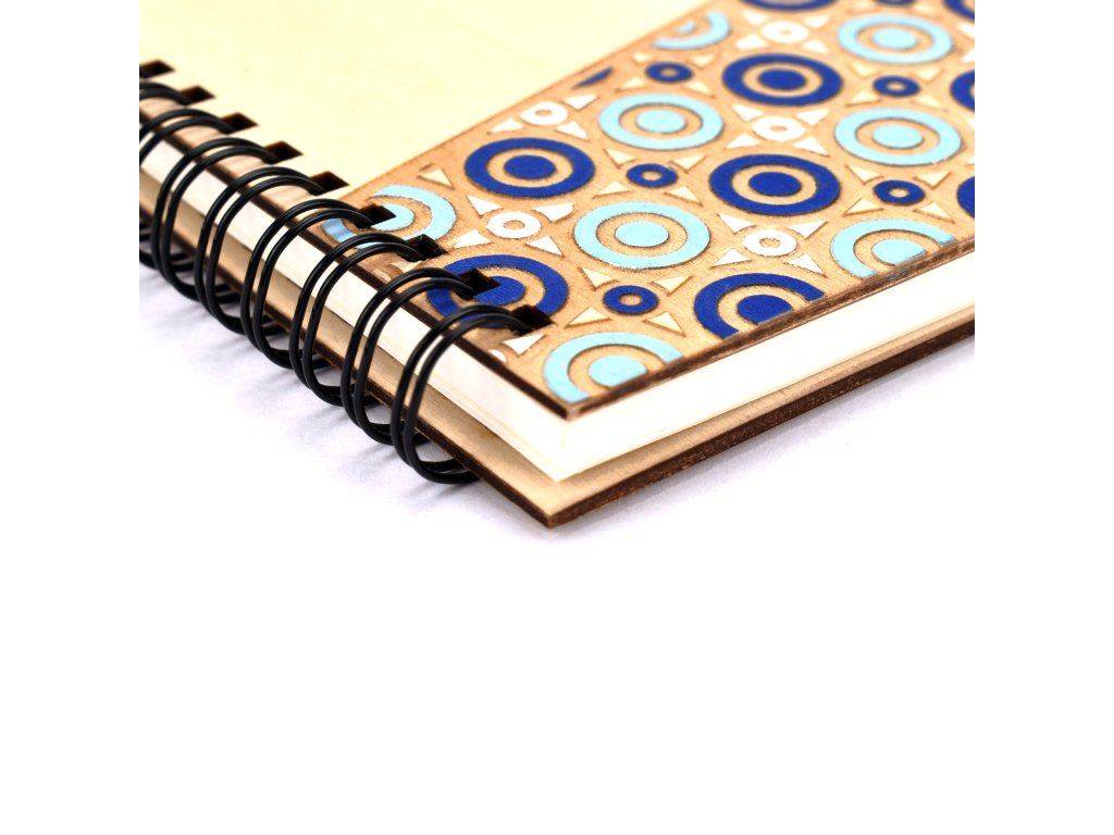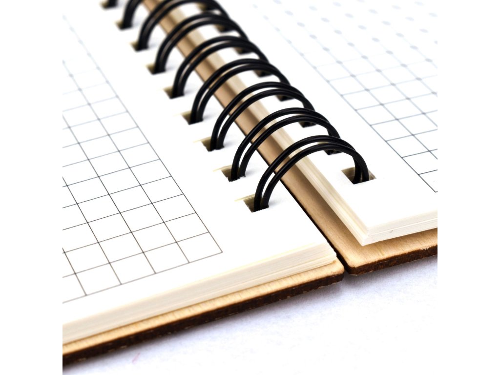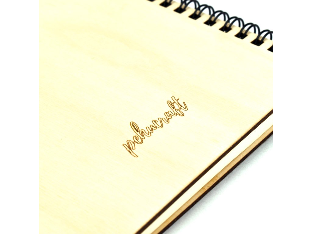 Desky dřevěného poznámkového bloku jsou z březové překližky tloušťky 3 mm kvality BB/BB. Kroužková kovová vazba černá o průměru 14,6 mm. Formát papíru A5 je recyklovaný 80 g (mírně zažloutlý). V bloku je 40 listů. Můžete si vybrat variantu čtverečkovaný nebo bez linek (čistý) papír. Motiv na dřevě gravírován laserem a povrch je přírodní a nelakován. Překližka je vyříznuta laserem, tudíž mohou být stopy po opálení, které dávají přírodní medový nádech. Boční strany opálené, částečně možno smýt vodou.